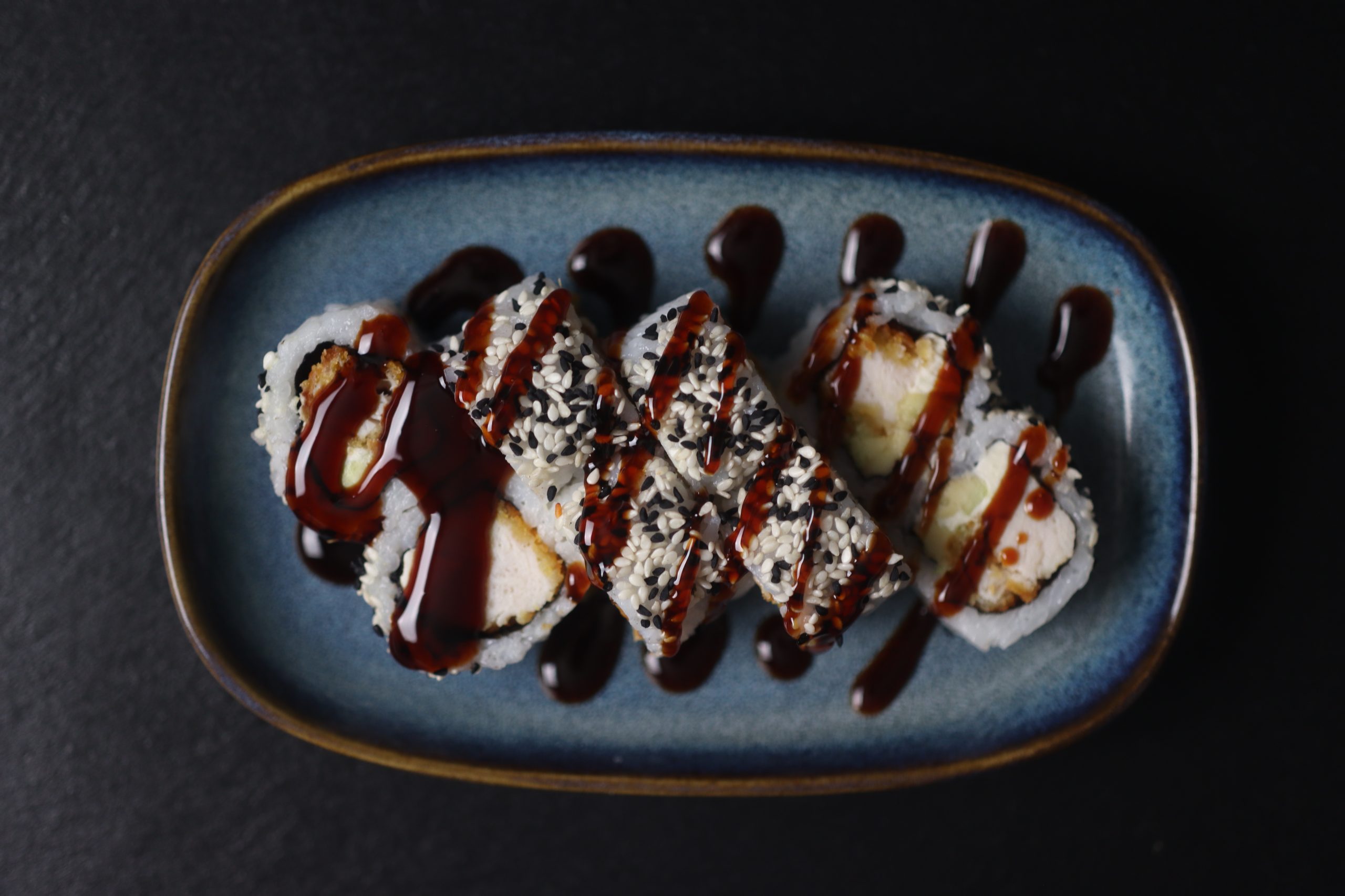 Kylling, avocado, agruk, topping teriyaki sauce, forårsløg (8 stk.)