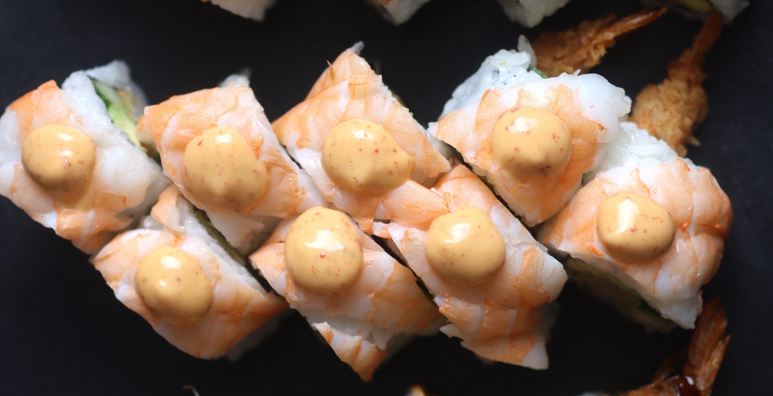 Surimi, Avocado, Cucumber, Topped with Tiger Prawn and Spicy mayo (8 stk.)