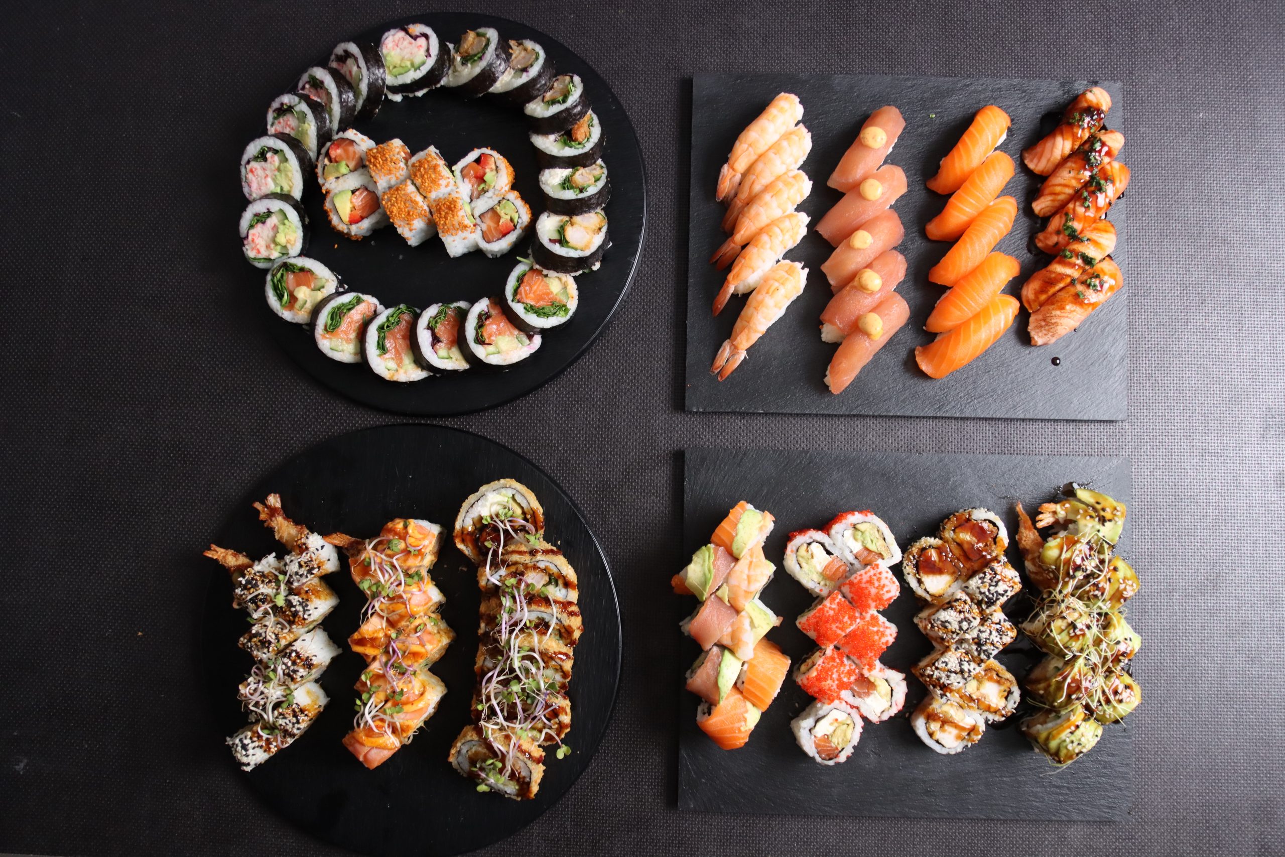 Dragon Roll (8 Stk.), 1 Spicy Laks (8 Stk.), 1 Crispy Chicken (8 Stk.), Alaska (8 Stk.), 1 Hot Ebi (8 Stk.) 1 Stor Laks Roll (6 Stk.), 1 Stor Califonia (6 Stk.), 1 Stor Tempura Roll (6 Stk.), 5 Nigiri Laks , 5 Nigiri Spicy Tun, 5 Nigiri Reje, 5 Nigiri Laks Tataki