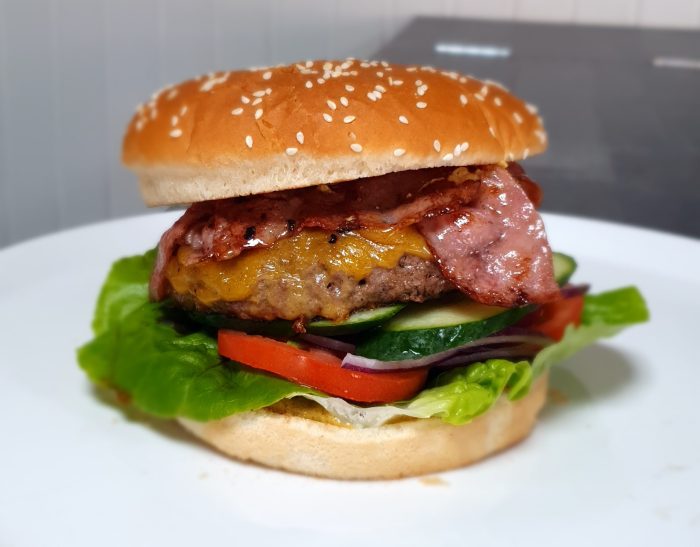 bøf (200 g), ost og bacon