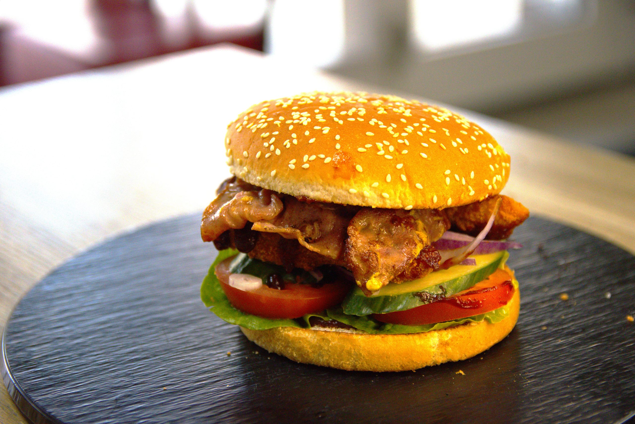 Brød, bbq, mayo, salat, tomat, løg, agurk,